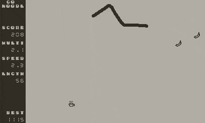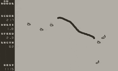 I'm also introducing a new "veer" mechanic. I really like doing sharp turns sometimes and I wanted to add a lil bit of extra tension by adding a risk-reward mechanic around it. You can now do a sharp turn (if you're successful, you'll see dust being kicked up... because sure, that's definitely how snakes work). When you do, you get a very short window where you can score extra points by increasing your multiplier by 0.3 for 1s. In other words, if you manage to do a sharp turn riiiight before picking up a banana, you get extra points without picking up extra speed from the coffee. Just be careful not to zig-zag into yourself by doing that.